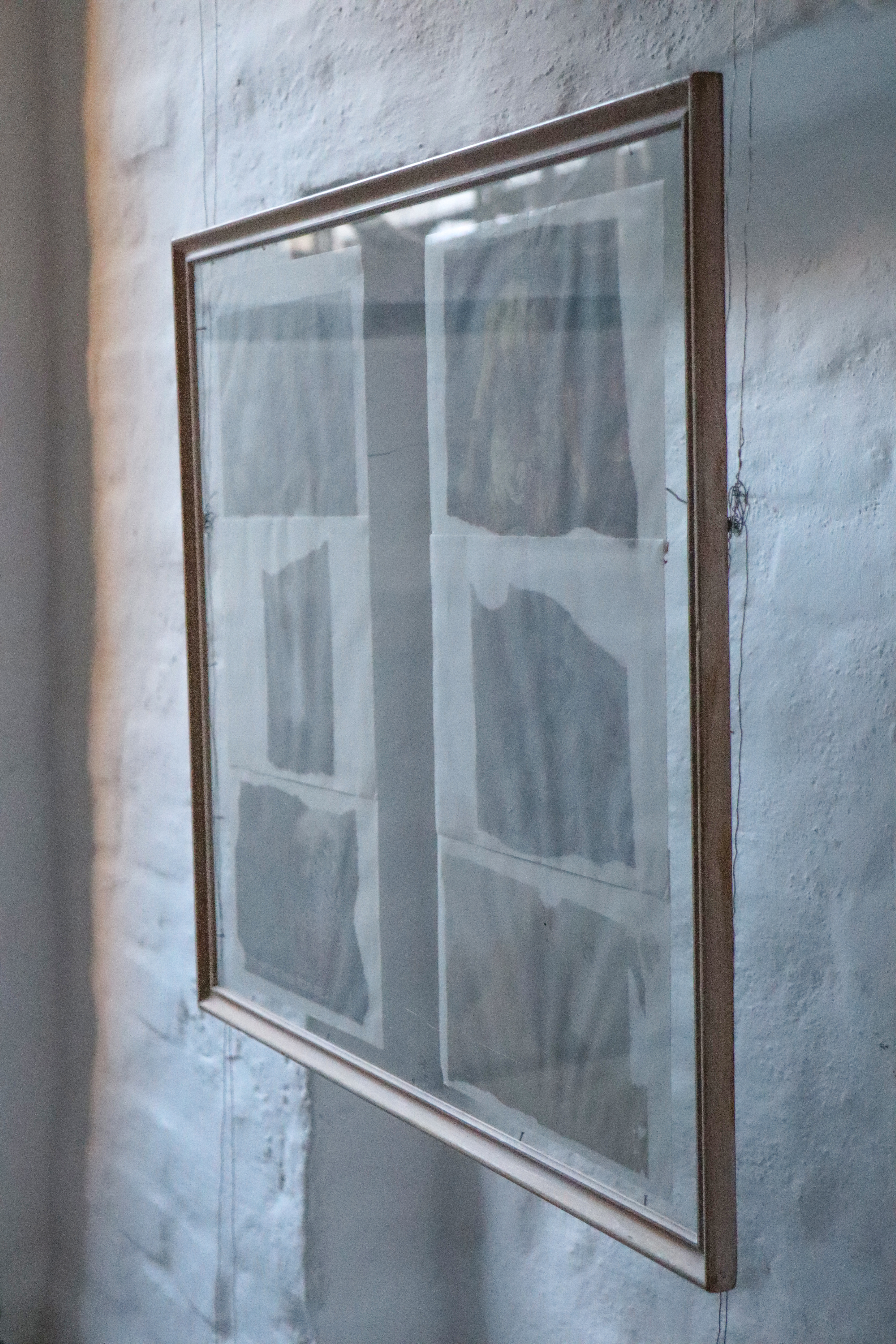 Printed images, transparent envelopes, wood frame, nails, steel wire